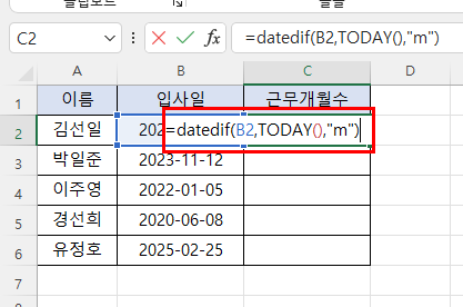 C2셀에 커서를 놓고 경과된 기간을 구하는 비공식 함수인 '=DATEDIF' 입력합니다.