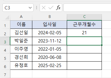 개월수가 계산표시되었습니다. 나머지는 채우기핸들을 이용해 밑으로 잡아 내립니다.
