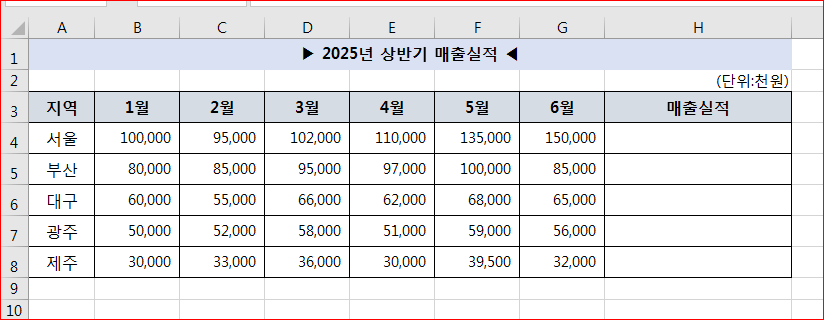 1월부터 6월까지의 상반기 매출실적표에서 실적을 한눈에 보기쉽게 셀안에 표시해보겠습니다.