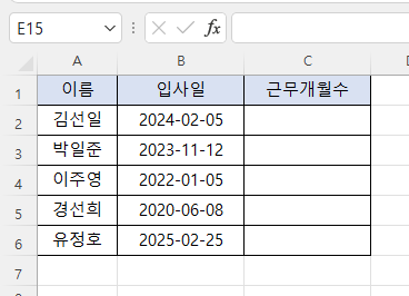 입사일부터 현재 오늘까지의 근무개월수를 함수를 이용해 계산해보겠습니다.