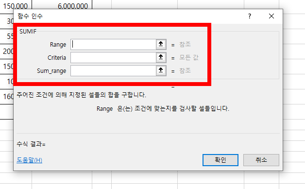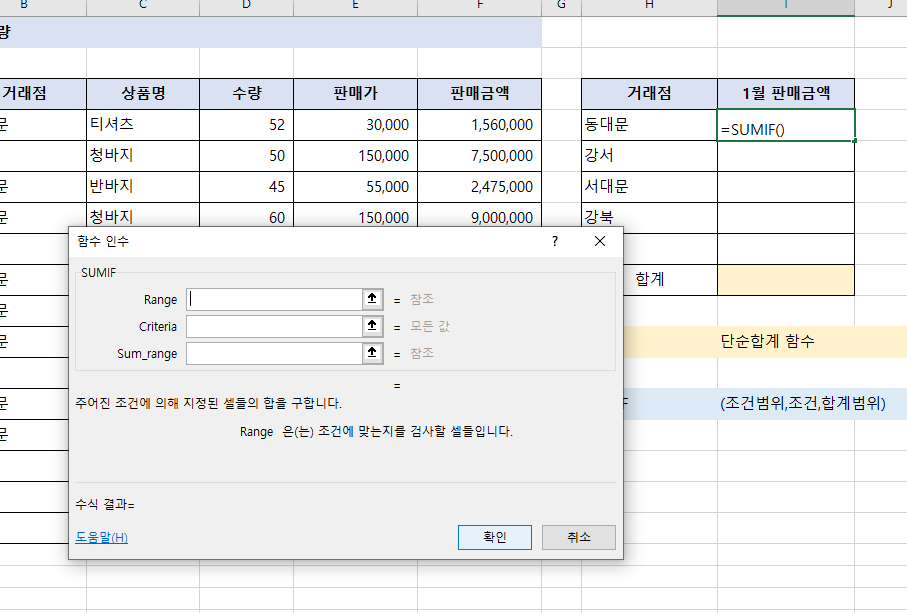 SUMIF함수 마법사를 불러왔습니다. 확인을 누릅니다.