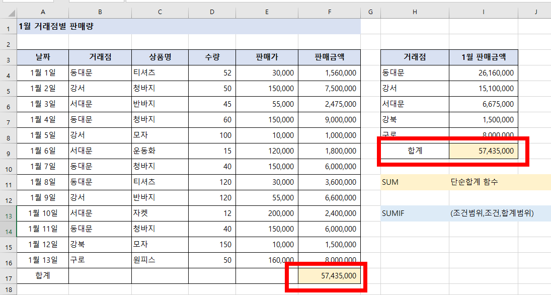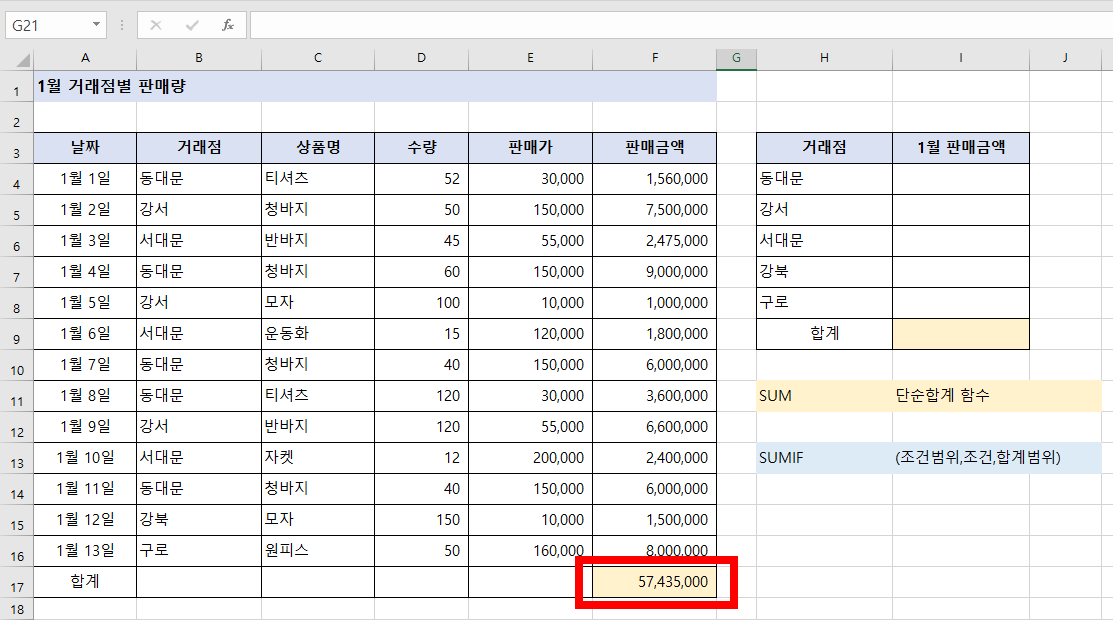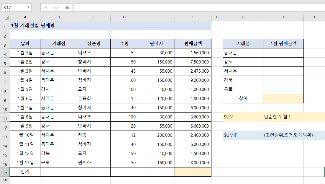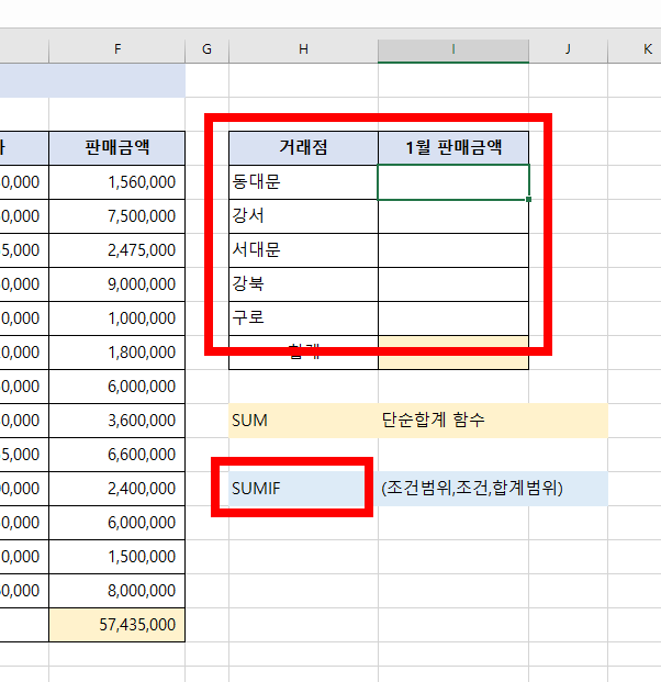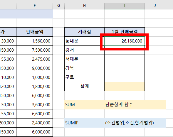 오른쪽 표의 거래점별 판매금액을 조건별합계 함수인 SUMIF를 사용해 구해보겠습니다.