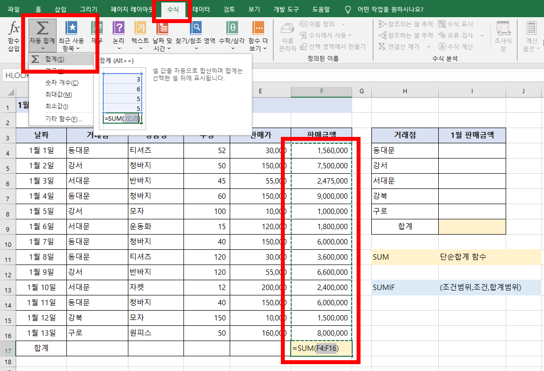 누르면 F열의 판매금액이 자동범위설정되면서 F17셀에 SUM함수가 나타납니다.