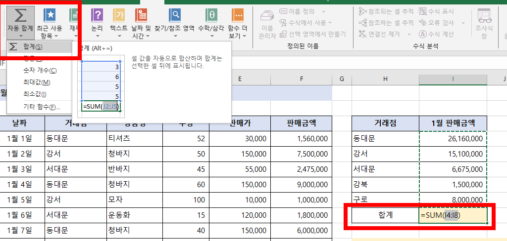 동대문합계 셀에 채우기핸들로 밑으로 드래그합니다.