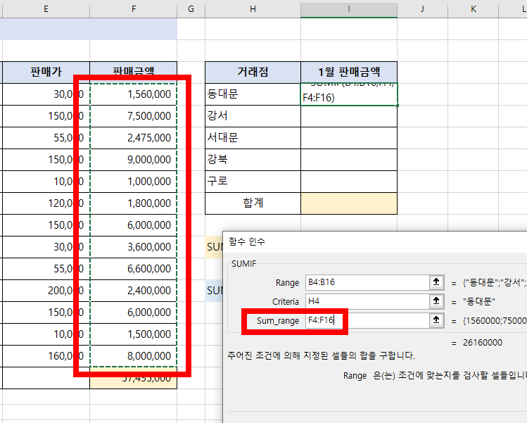 세번째 인수는 판매금액 F4부터 16셀까지 해당열을 범위지정합니다.