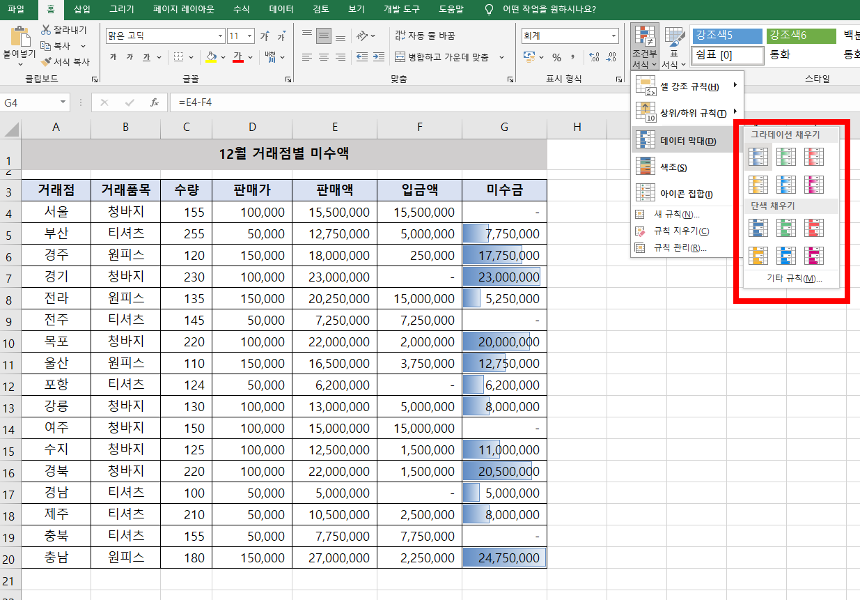 그러면 범위지정한 미수금열에 금액만큼의 그래프가 표시됩니다.