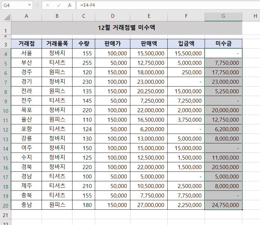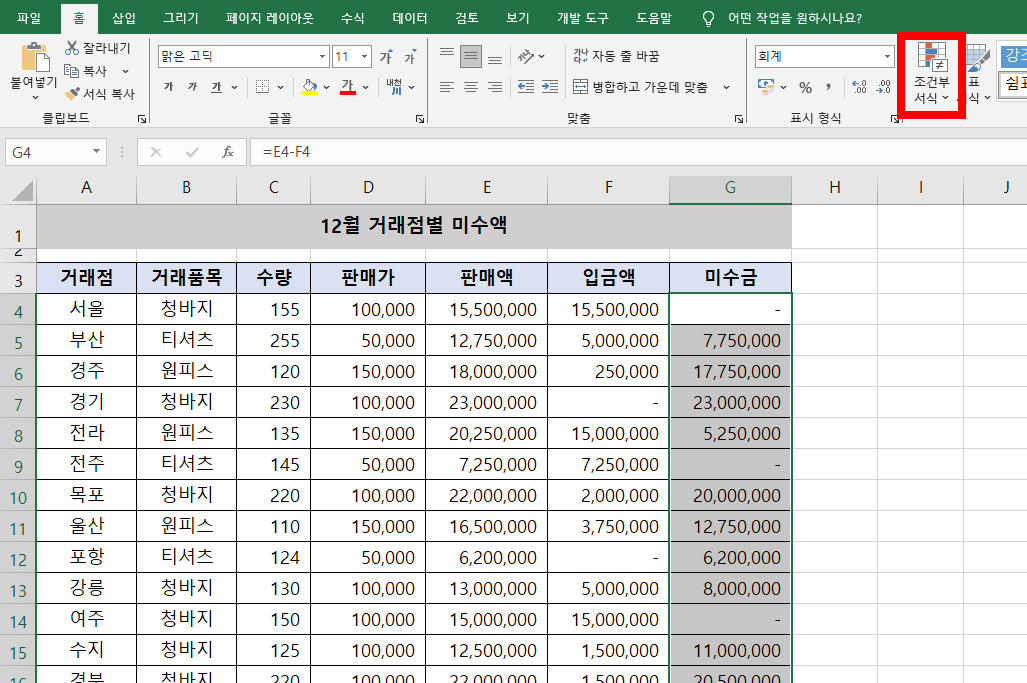 먼저 미수금열을 범위지정합니다.