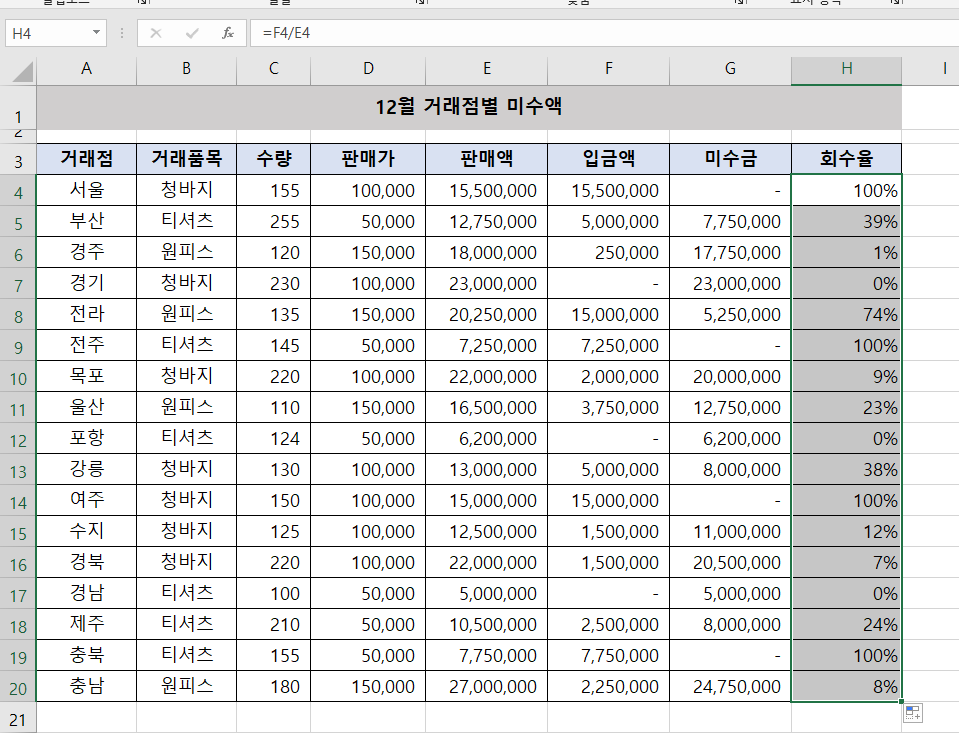 표 끝에 열을 하나 추가해서 '미수금회수율'을 계산합니다.
