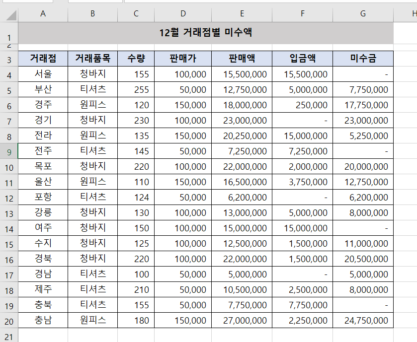 표에서 미수금이 있습니다.