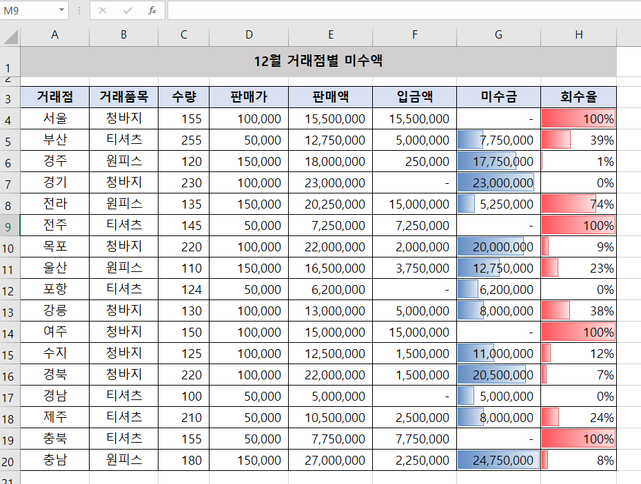 미수금과 회수율에 데이터막대를 표시해 눈에 보기 쉽게 표시했습니다.