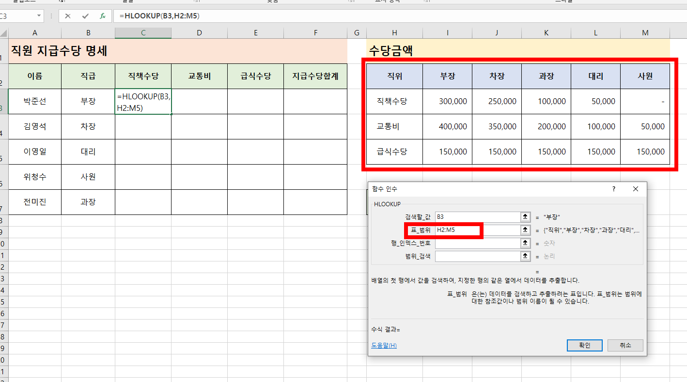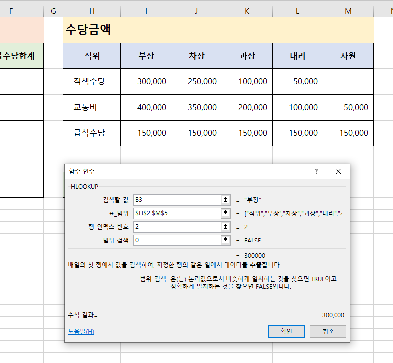 세번째 인수는 직책수당은 표에서 2번째 줄이므로 '2'를 입력합니다.