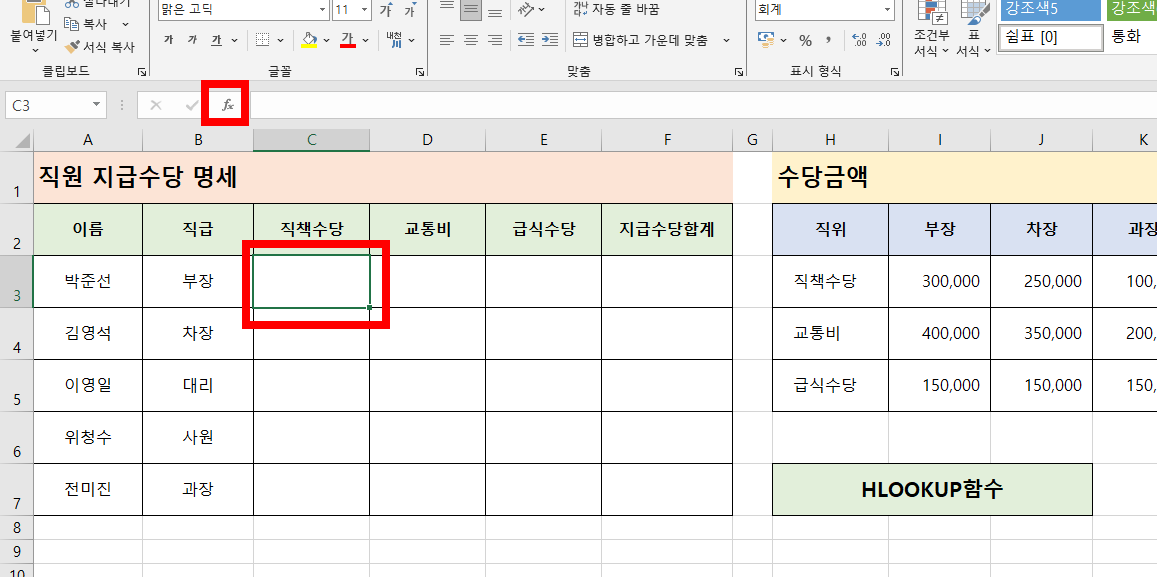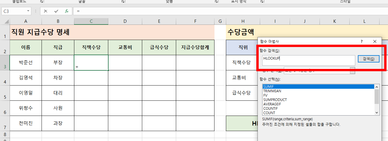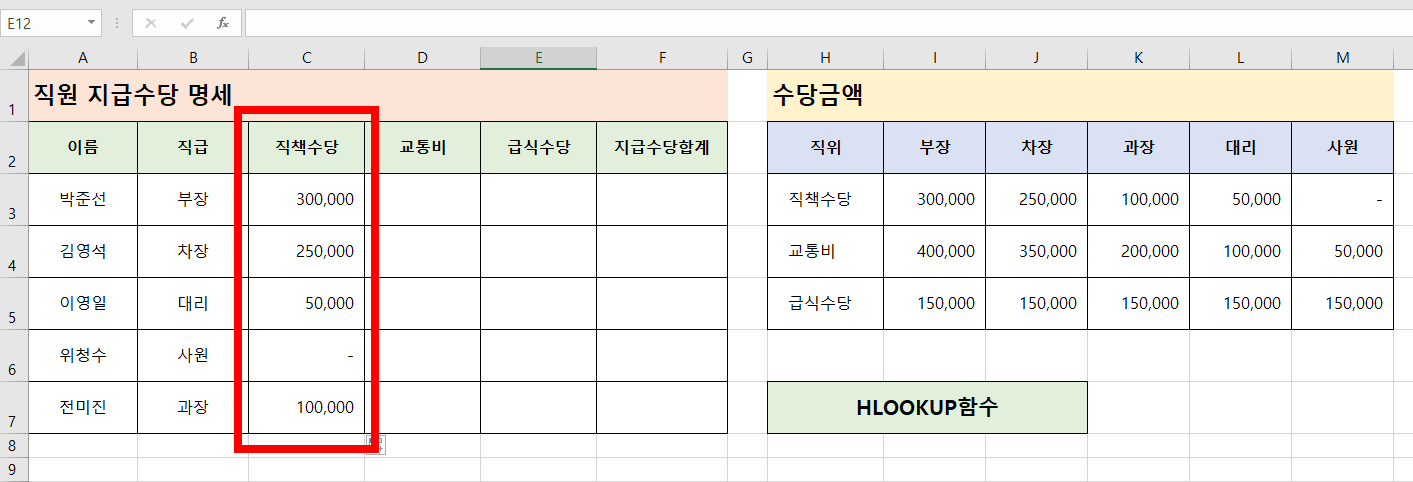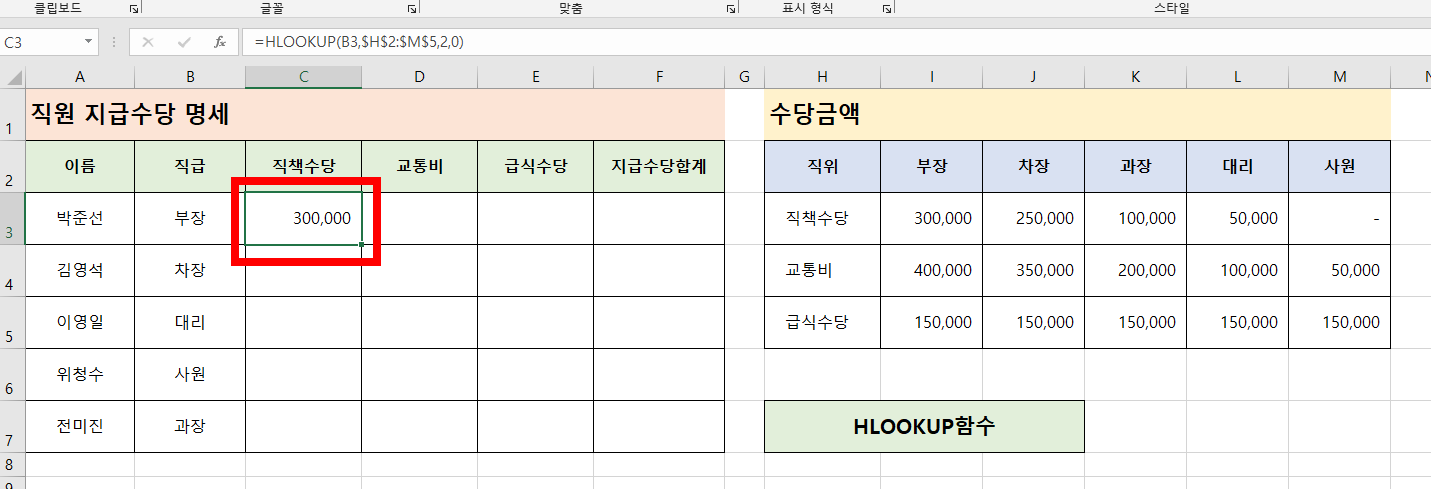 그럼 직책수당 셀에 부장의 직책수당액이 표시됩니다.