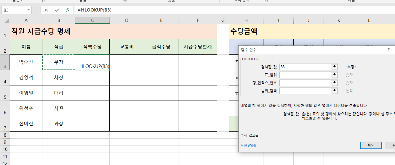 첫번째 인수는 직급이니까 B3셀을 클릭합니다.
