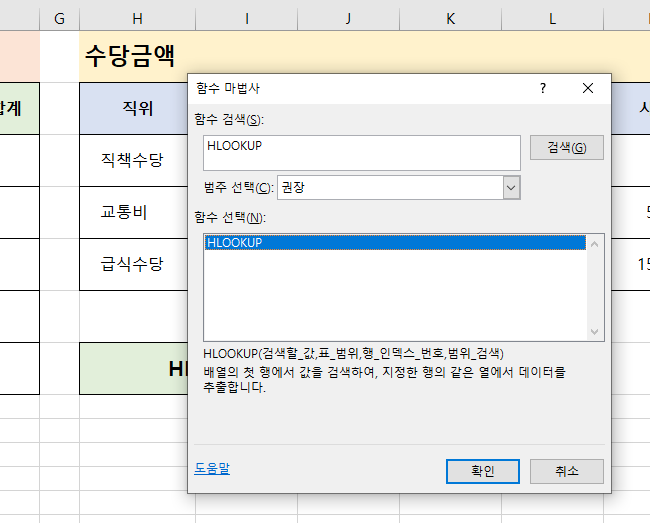 함수마법사가 실행되면 HLOOKUP함수를 입력해서 검색합니다.
