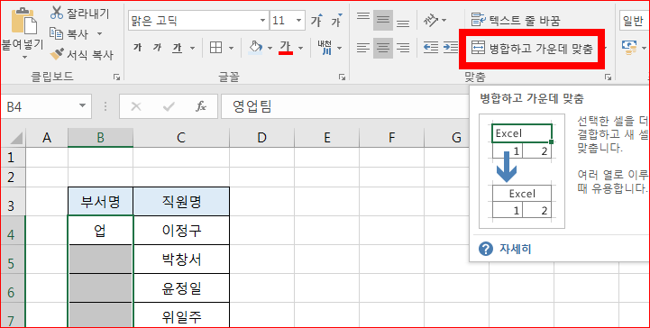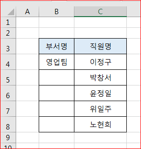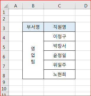 부서명에서 같은 팀명인 영업팀이 세로방향으로 표시가 되었습니다.