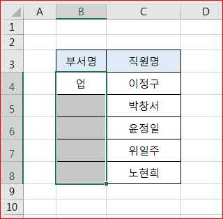 영업팀셀 B4셀부터 B8셀까지 범위지정합니다.