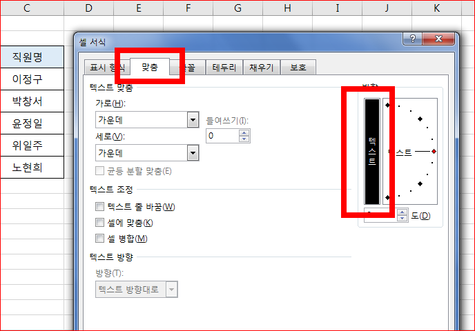 대화상자가 나오면 맞춤탭을 클릭하고 방향에서 세로텍스트를 지정하고 확인을 누릅니다.