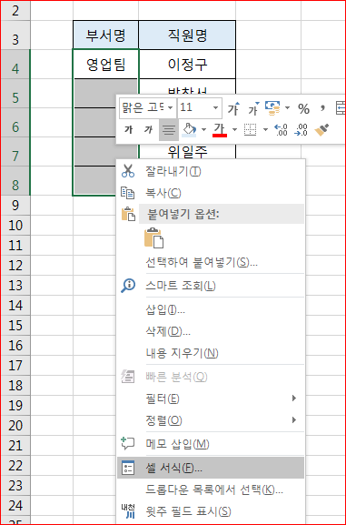 그위에 마우스대고 오른쪽 눌러 메뉴가 나오면 셀서식을 클릭합니다.
