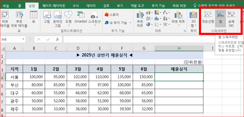 H4셀에 커서를 놓고 메뉴에서 삽입에서 스파크라인중에서 열을 이용해 표시해 보겠습니다.
