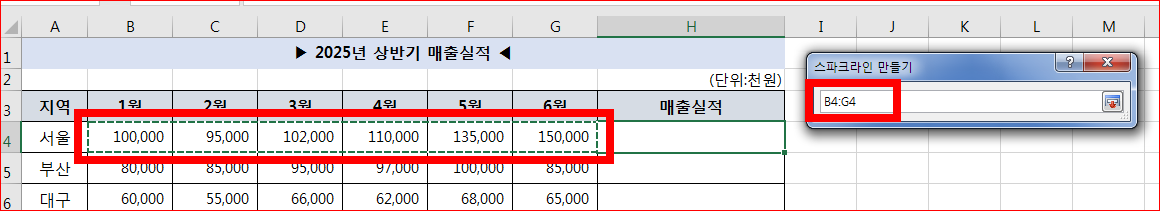 열을누르면 스파크라인만들기라는 대화상자가 나타나는데 여기서 데이터범위 오른쪽 빨간화살표를 눌러