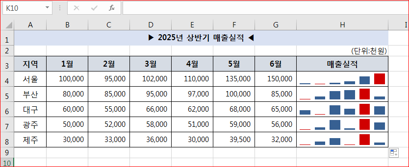 1월부터 6월까지의 상반기 매출실적표에서 실적을 한눈에 보기쉽게 셀안에 표시해보겠습니다.