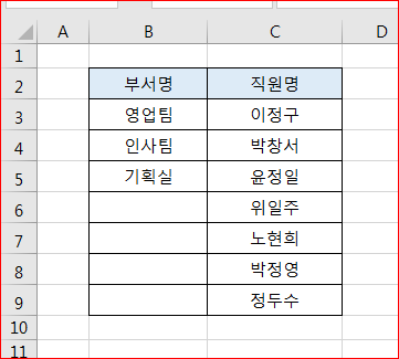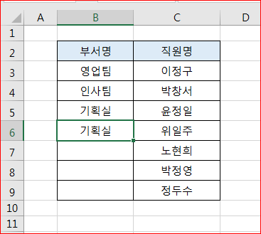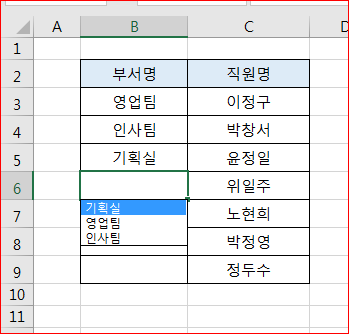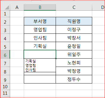 이중에서 입력할 부서명을 지정한 다음 엔터를 치면 입력됩니다.