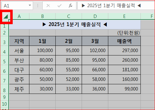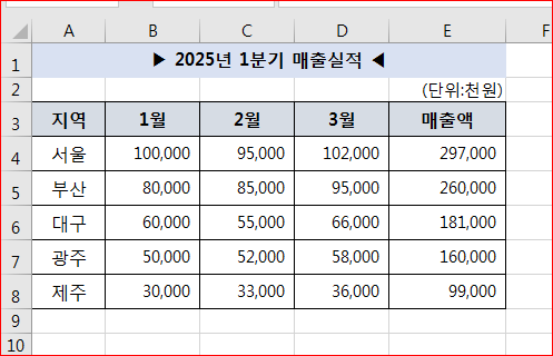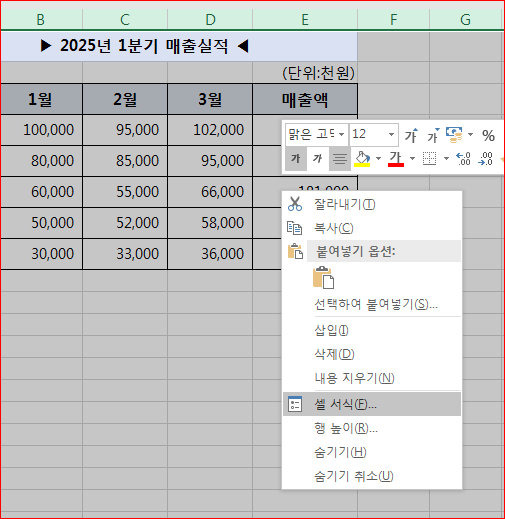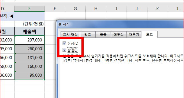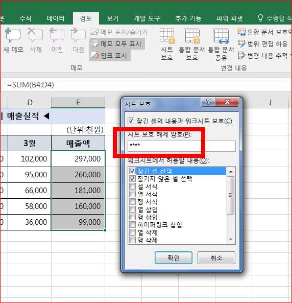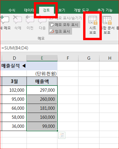 표에서 매출액을 수정하지 못하게 셀부분만 암호를 걸어보겠습니다.