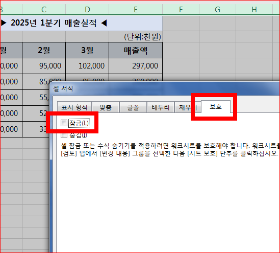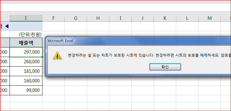 매출액을 수정하려고 셀을 클릭하면 보호되었다는 메시지가 나타나면서 입력이 되지 않습니다.