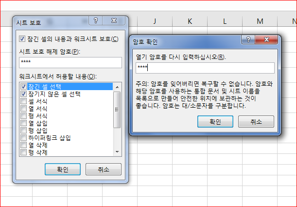 시트보호 대화상자가 나타나면 임의의 암호를 입력하고 확인 누릅니다.