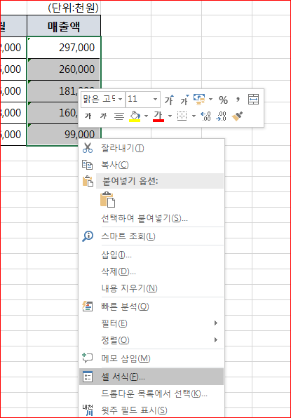 마우스오른쪽 눌러 메뉴가 나타나면 셀서식을 클릭합니다.