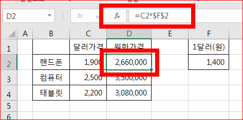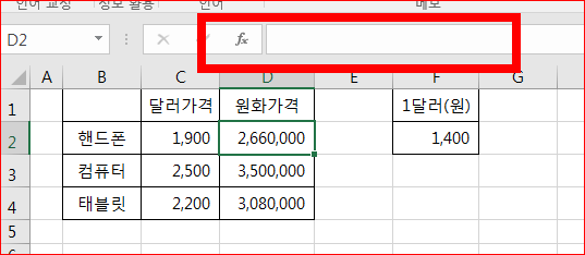 표에서 수식을 만들어 계산하면 위 수식입력줄에 수식이 표시됩니다.