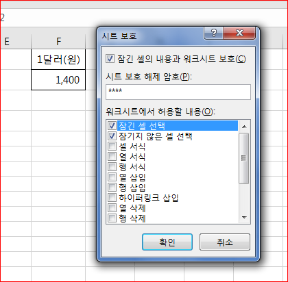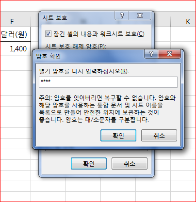 시트보호대화상자가 나타나면 임의의 암호를 입력하고 확인 누릅니다.