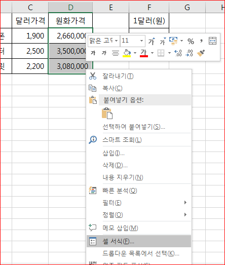 계산한 셀을 범위지정한 다음 마우스오른쪽 눌러 메뉴에서 셀서식을 누릅니다.
