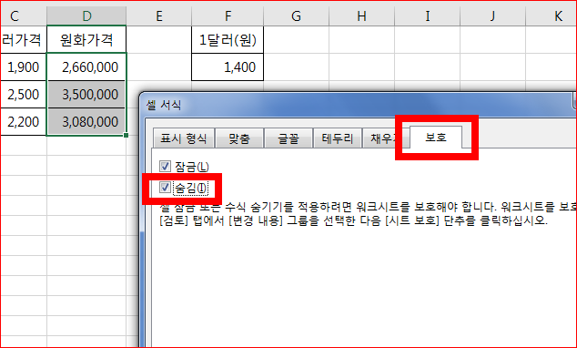 대화상자나 나타나면 보호탭에서 숨김에 체크하고 확인눌러줍니다.