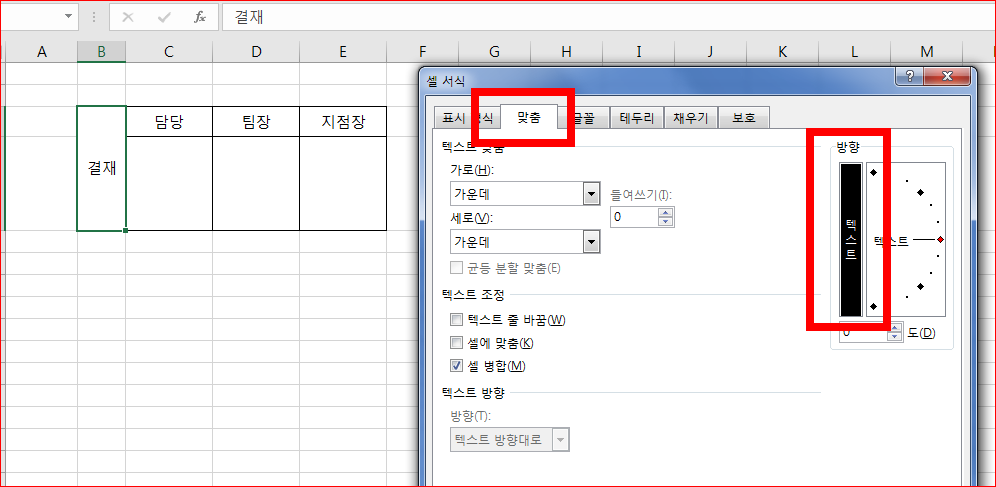대화상자가 나타나면 맞춤탭에서 방향을 세로텍스트를 누르고 확인을 누릅니다.