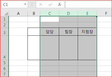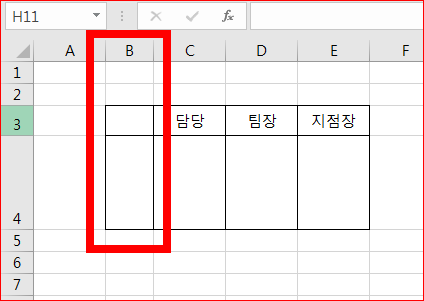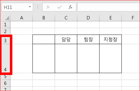 담당, 팀장, 지정장등 내용이 들어가는 열의 너비도 알맞게 조정합니다.
