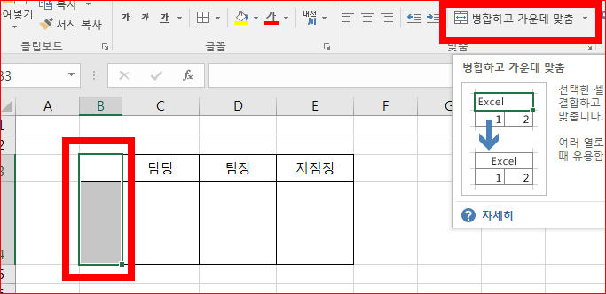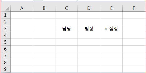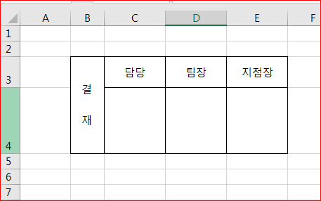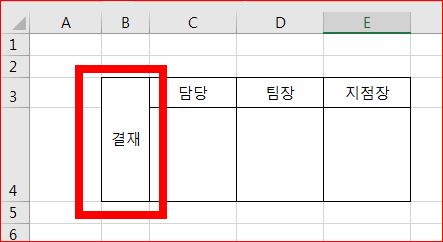 결재가 들어갈 열을 범위지정한 다음 병합하고 가운데 맞춤을 클릭해서 합칩니다.