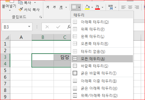 표를 만들기위해 범위를 지정한 다음 모든테두리 클릭합니다.