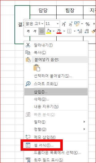 셀에 대고 마우스오른쪽을 눌러 메뉴에서 셀서식을 클릭합니다.