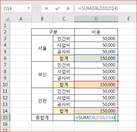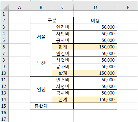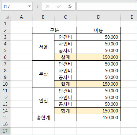 합계항목이 모두 더해 총합계가 계산되었습니다.