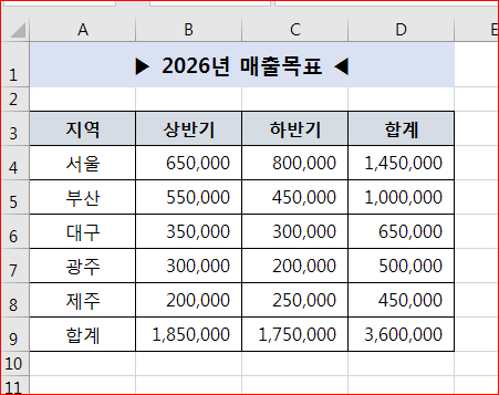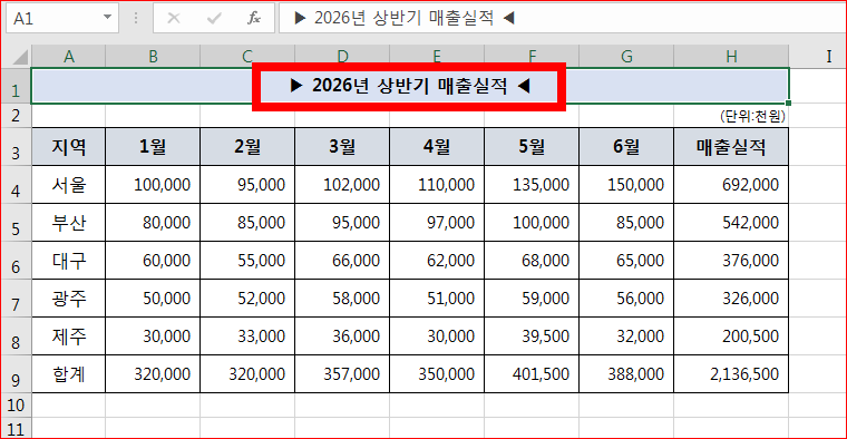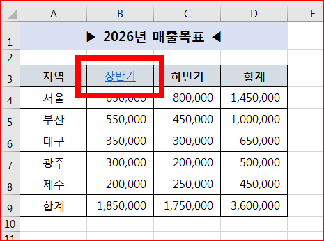 매출실적표에서 다시 원래 매출목표로 이동하려면 표제목인 상반기 매출실적에 위 설명한 방법대로