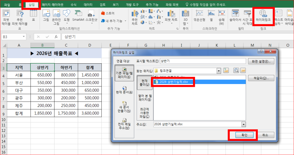 상반기셀인 B3에 커서를 놓고 메뉴의 삽입에 들어가 '하이퍼링크'를 클릭하면
