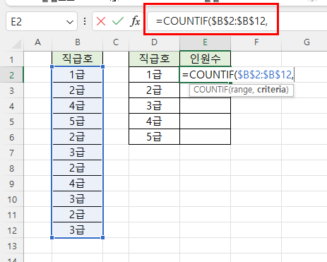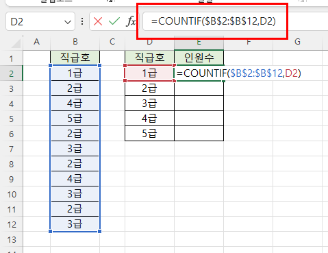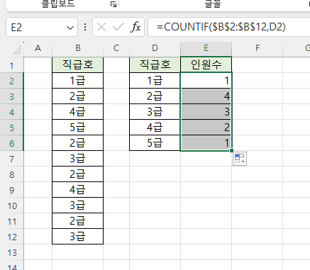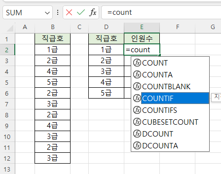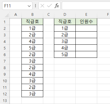 급수별로 인원수를 COUNTIF함수로 구해보겠습니다.