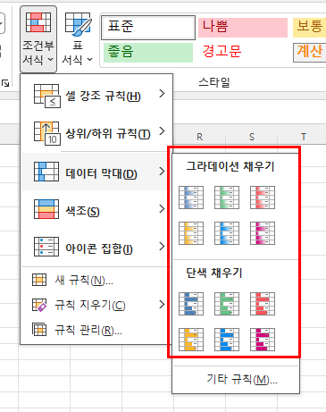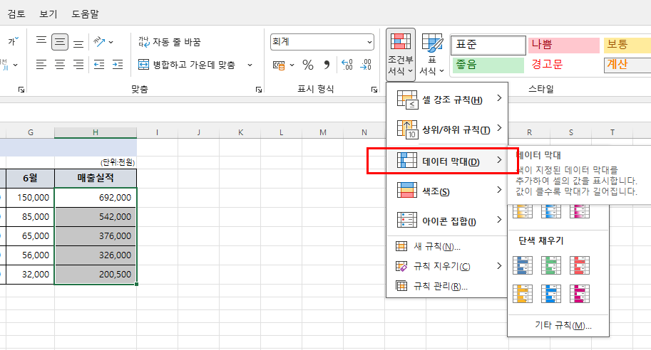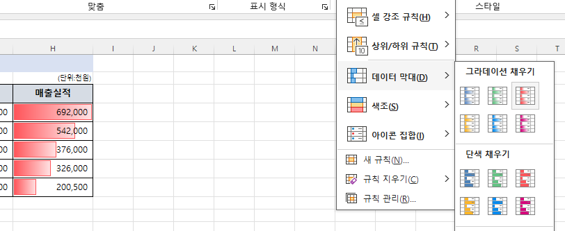 매출실적에서 데이터만 범위지정한 다음 메뉴에서 '조건부서식'을 클릭하면 '데이터막대'에 포인터를 대면