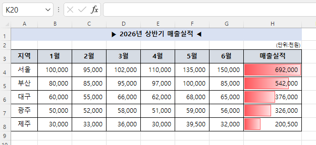 그라데이션의 빨간색을 클릭하니 왼쪽 데이터표의 매출실적에 막대그래프가 표시됩니다.