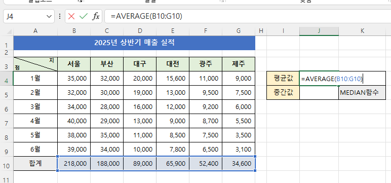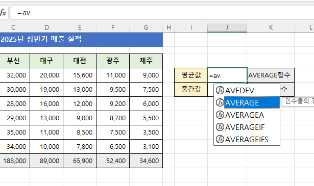 실적의 평균값을 구하려면 J4셀에 커서를 놓고 평균구하는 함수인 AVERAGE함수를 불러옵니다.