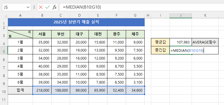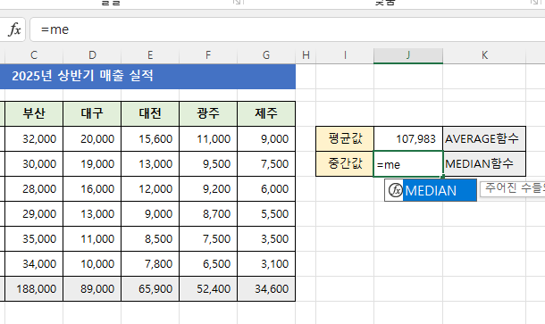 J5셀에 커서를 놓고 중간값을 구하는 함수인 MEDIAN함수를 불러옵니다.