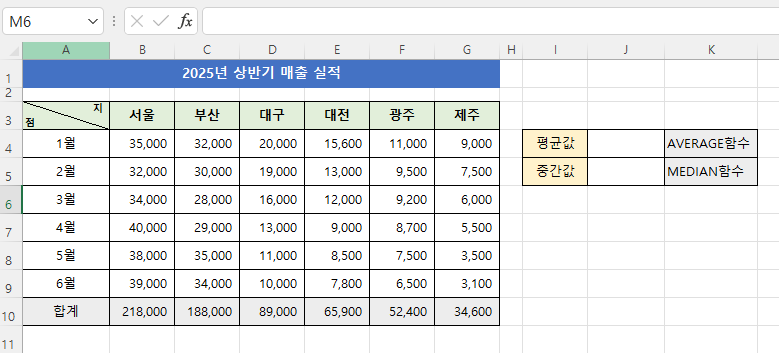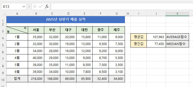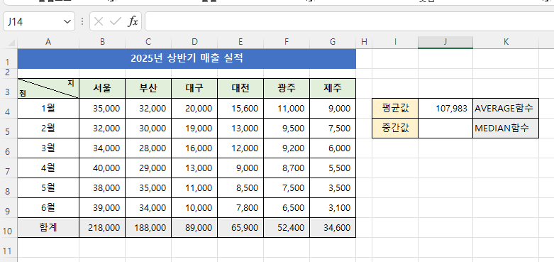 지점별 합계중 가장 중간에 가까운 값인 중간값을 구했습니다.