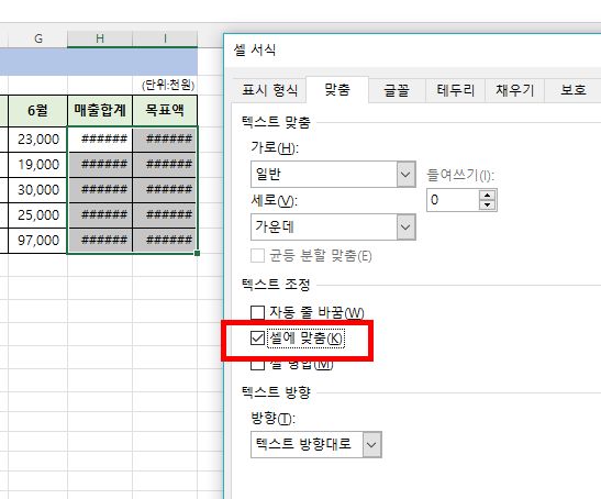 셀서식의 '맞춤'탭에서 '셀에 맞춤'에 체크를 하고 확인을 눌러줍니다.