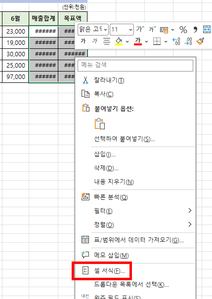 해당셀의 너비를 늘려주면되는데, 합계금액의 단위가 커서 #으로 바뀔경우 일일이 셀너비를 키워주는게